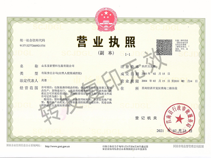 山東亞新塑料包裝有限公司成立于2000年10月,是一家以生產(chǎn)塑料包裝膜、塑料彩印包裝袋為主營(yíng)業(yè)務(wù)的企業(yè)。公司占地47952平方米,車(chē)間、辦公樓、宿舍樓建筑面積達(dá)4萬(wàn)多平方米,注冊(cè)資本16000萬(wàn)元,擁有固定資產(chǎn)8474萬(wàn)元,流動(dòng)資金2500萬(wàn)元。
